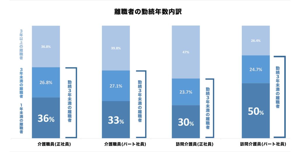 特に介護業界においては3年以内に辞める離職率は驚異の50%と非常に高い水準を示しており、今後の介護経営を安定させるためには「如何にして、3年未満の離職者を減らすか」という視点が必要になります。