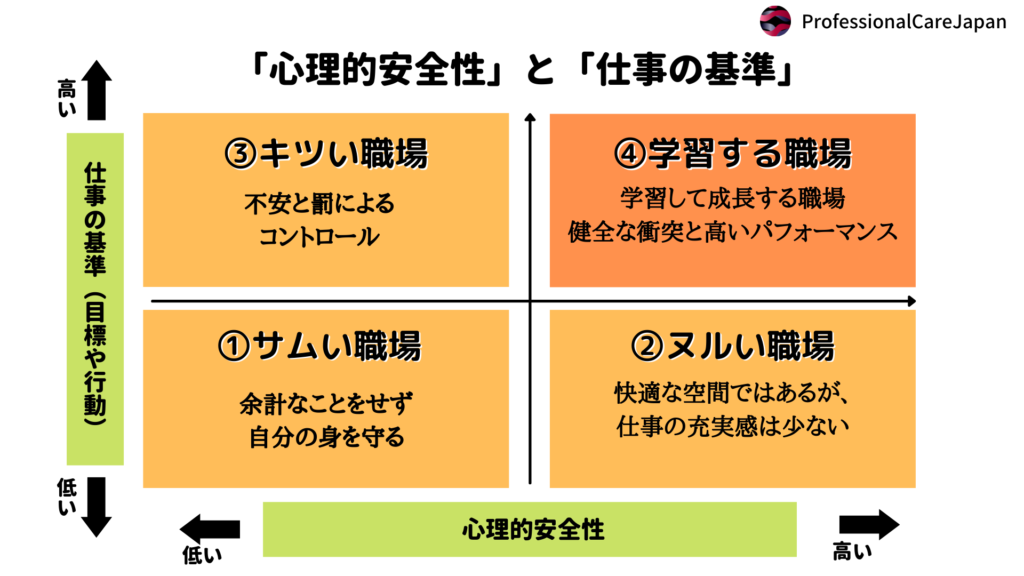 心理的安全性が高い=ただの仲のよい職場ということではなく、ここには、「高い仕事の基準」が求められます。